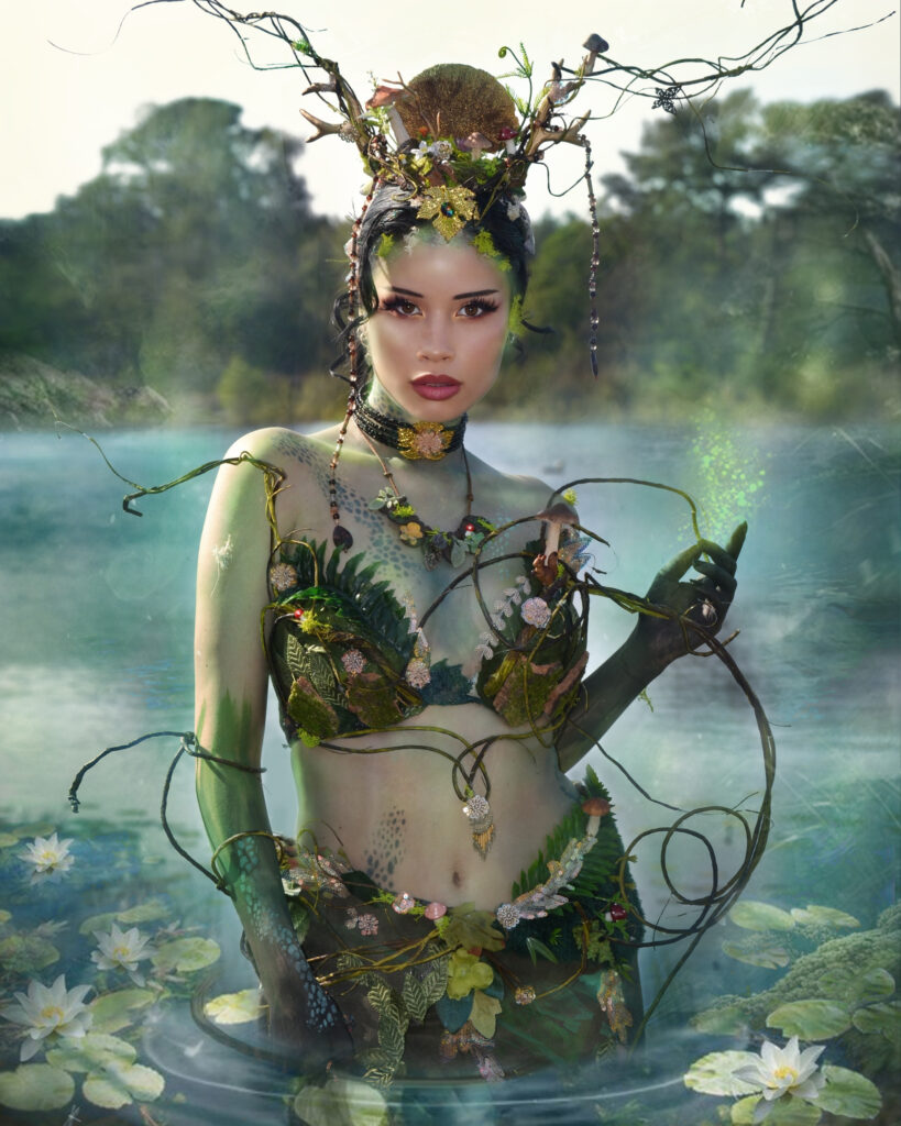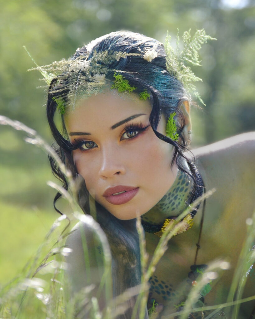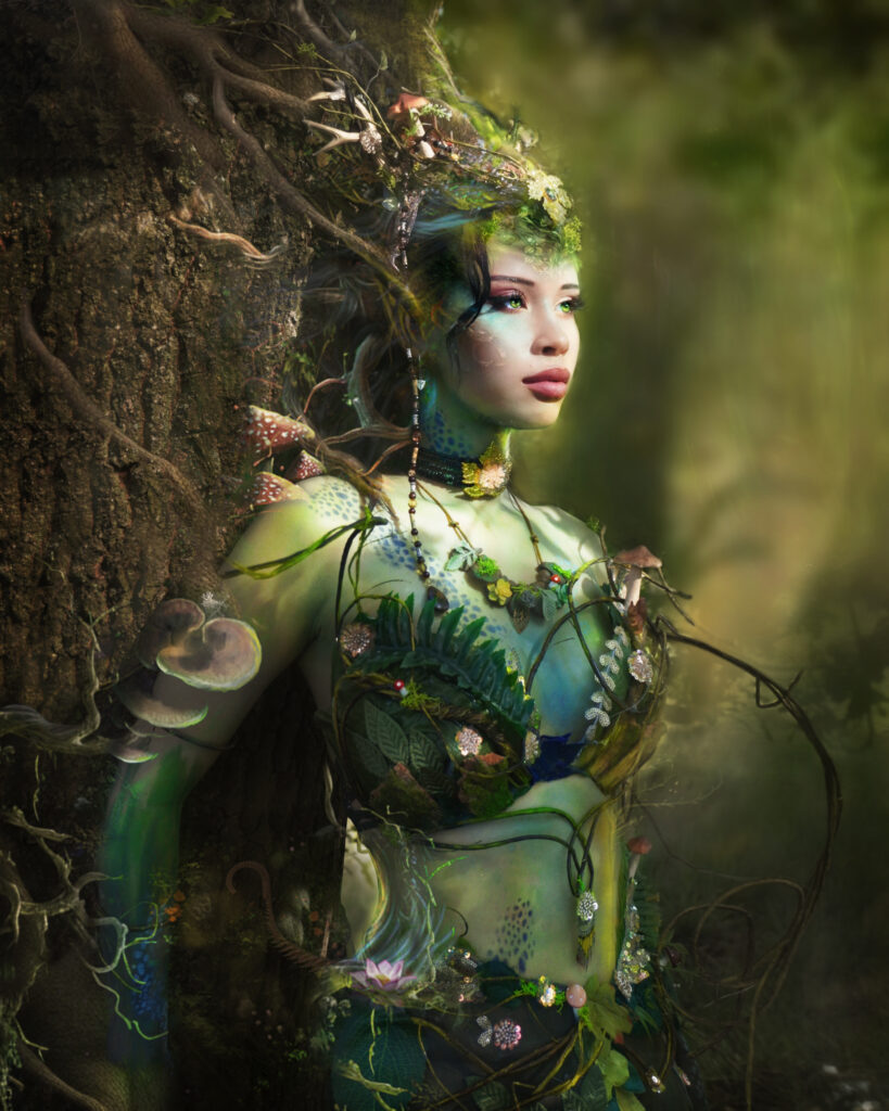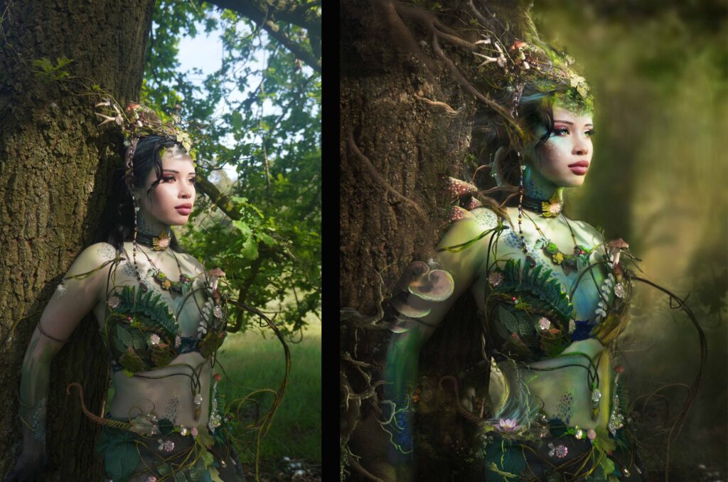 For Lisa I first created an dryad costume and made the Bodypainting and Make up. I chose a beatiful outdoor location. The first picture shows the before and after the retouching process.